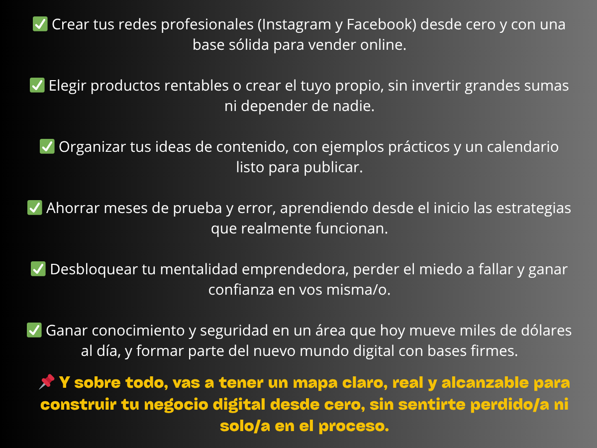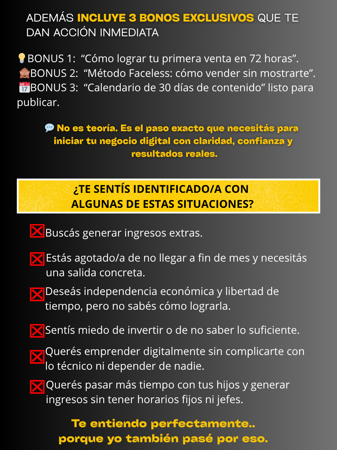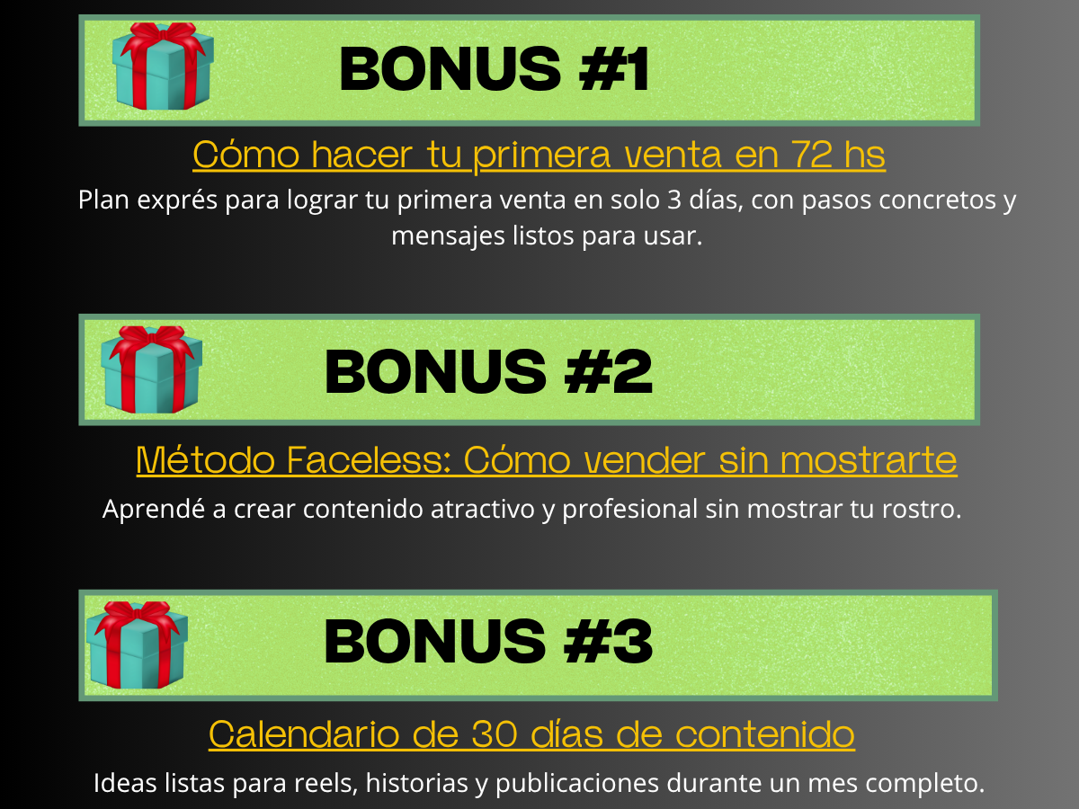 un producto hasta enviar tu primer mensaje de venta. También INCLUYE 3 BONOS que te ayudan a acelerar tus resultados: un Calendario de 30 días de contenido, el Método Faceless que te enseña a vender sin mostrarte y una guía express para tu primera venta en 72 hs.